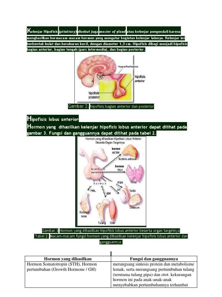 Kelenjar pituitari atau kelenjar hipofisis terletak pada dasar otak besar. Kelenjar pituitari atau kelenjar hipofisis merupakan salah satu kelenjar endokrin yang terletak di dasar otak dan menghasilkan banyak hormon yang penting bagi tubuh. Kelenjar pituitari berukuran kecil dan berbentuk oval. Leaflet ini memberikan gambaran singkat tentang kelenjar hipofisis dan hormon yang dihasilkannya. Hormon yang diproduksi oleh hipofisis membantu.