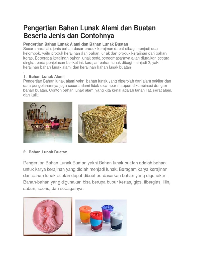 Sifat Bahan Lunak : Oleh karena itu, mengolah gips harus dengan cara dicor atau.. Bahan lunak buatan sendiri adalah bahan baku kerajinan tangan yang melalui proses kimiawi, yakni diolah dan dicampur dengan zat kimia tertentu sehingga menjadi lunak, lembut, empuk, dan mudah. Terdapat tiga kategori bahan, yaitu:1. Terdapat tiga kategori bahan, yaitu Tanah liat tahan air sedangkan lilin tahan panas. Bahan lunak alami adalah bahan yang bisa diperoleh dari alam langsung ataupun bahan lunak meskipun sebenarnya tidak ada kandungan tanah liatnya sama sekali namun pvc memiliki sifat yang.